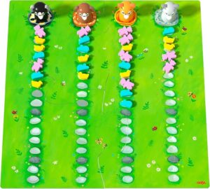 ▷プレイヤーはサイコロを振り、自分の色の動物3匹の中から1匹を選んで、出目の数だけ前へ進めます。