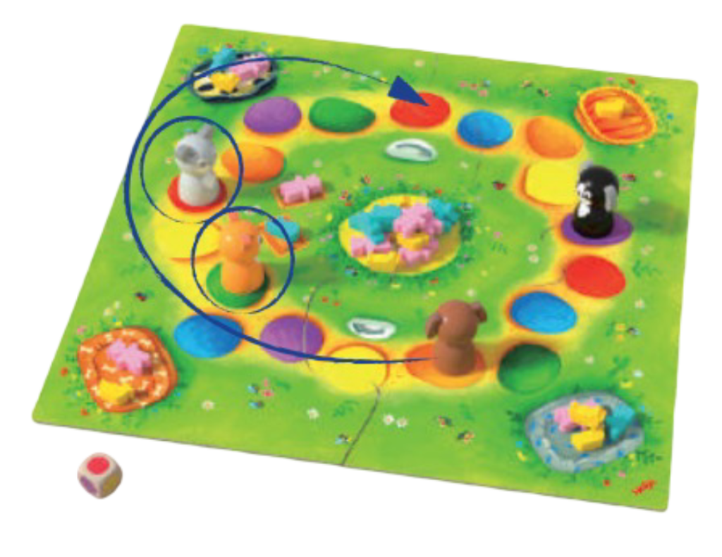 ▷サイコロを振って、 その色マスの一番近い空いているマスまで自分の動物コマを進める。