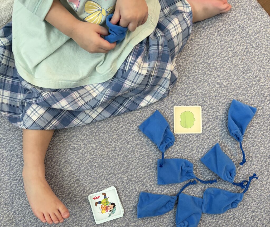 袋の上から手探りで違いを感じ取る体験は新鮮で、遊びながら自然と集中力や認識力が育ちます。
