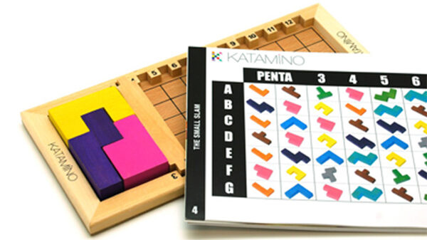 カタミノは、様々な形のブロックを組み合わせて枠を埋める、難易度調整できる頭脳パズルです。