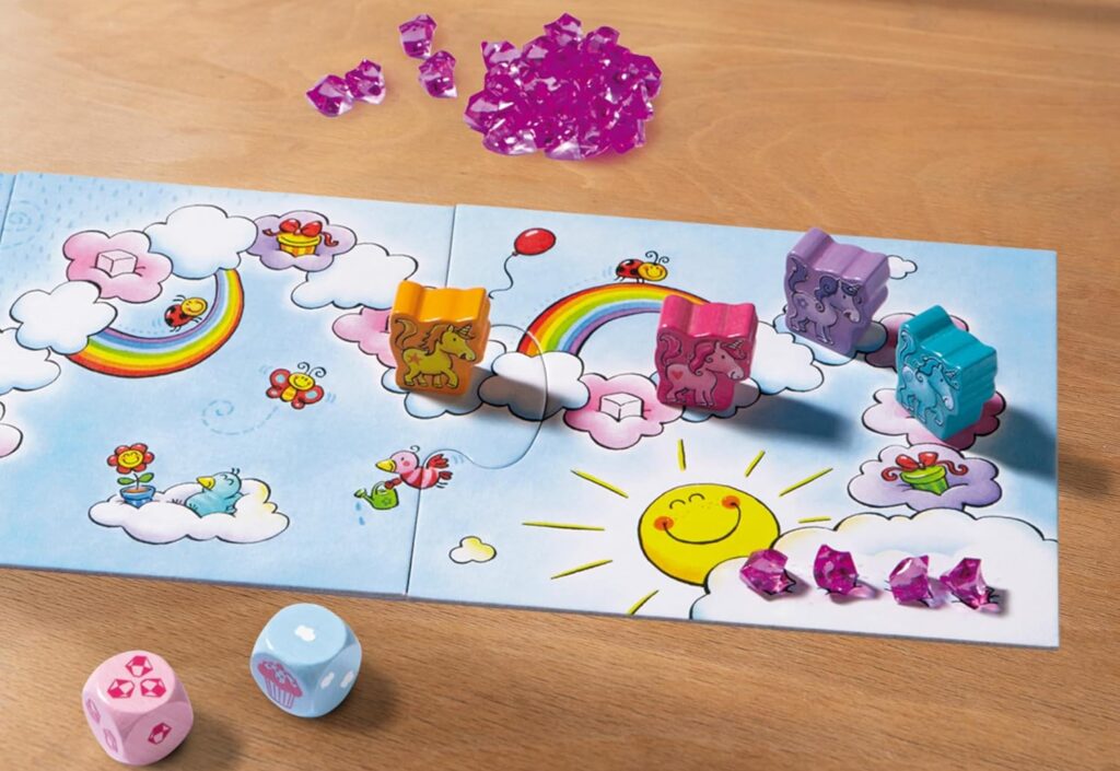 子ども向けボードゲームの定番、「雲の上のユニコーン」シリーズの中で1番ルールが簡単なので、3歳前半や2歳からでも楽しめます。