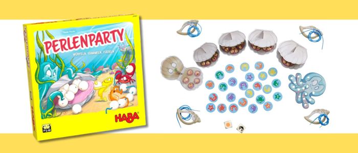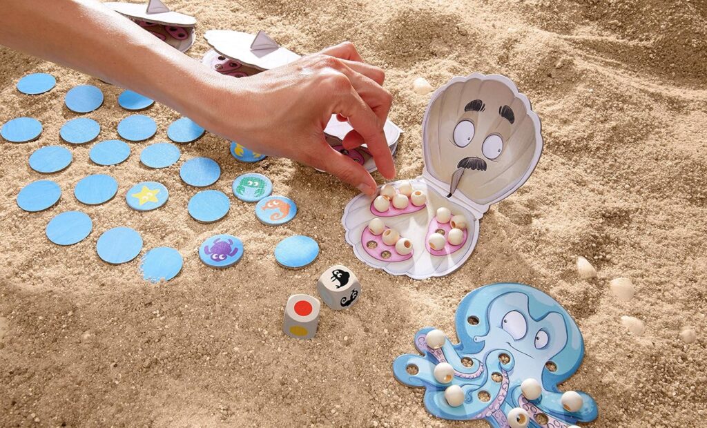 パールパーティーは、サイコロで指定された色と海の生き物のタイルを探し、見つけると貝から真珠をもらって飾りを作っていく、観察と手先遊びが楽しいゲームです。