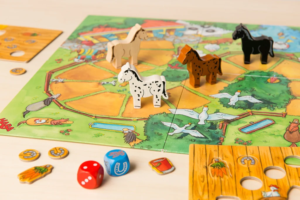 サイコロを振って馬を進めるだけでなく、必要なお世話道具を集める要素があるため、子どもが「進むか、道具を取るか」を考える場面が生まれます。