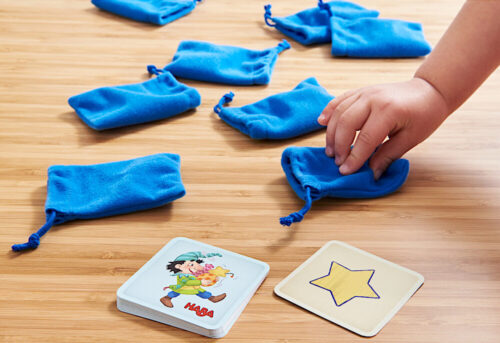手探りゲームは、カードに描かれたおもちゃの形を見て、魔法の袋の外側を触りながら同じ形の木のおもちゃが入った袋を探し当てるゲームです。