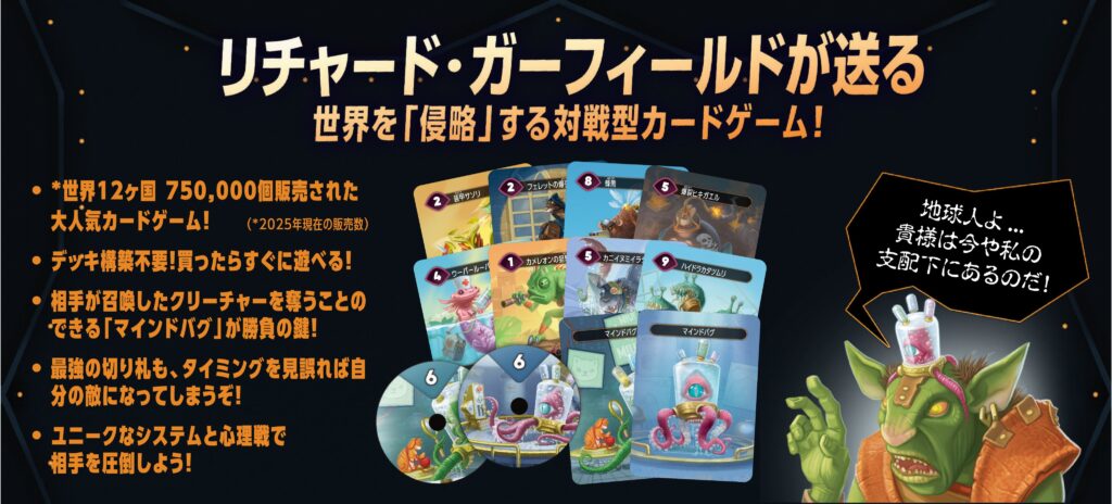 シンプルなルールで奥深い読み合いを味わえる、リプレイ性抜群のカードゲームです。