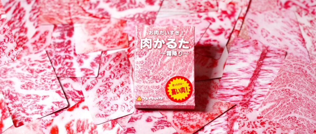 肉かるた 霜降りは、生肉で神経衰弱やババ抜きができるかるたの新バージョンです。