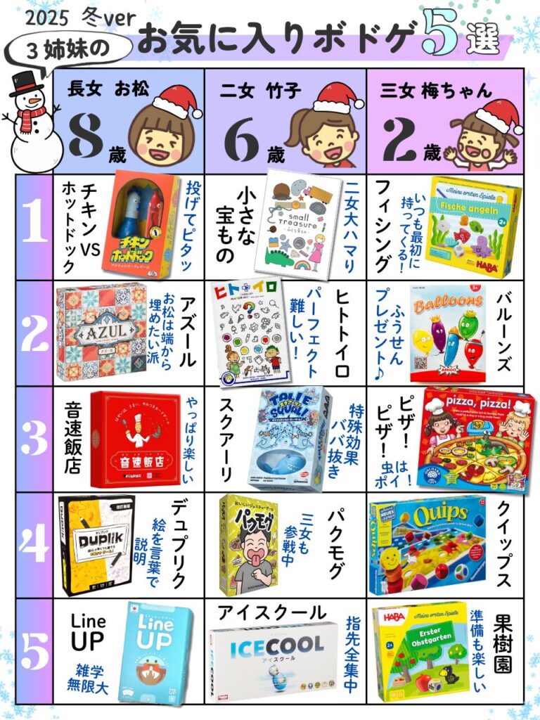子供が産まれる前からボードゲームが好きだった私は、まさに「ボ育て」すべくネットで色んな子供用ボドゲ(ボードゲームの略)を調べ、教育のためだからと夫に言い訳しながら買い漁り実践しています。(2025年から私の貯金から買うことにしたので、もう特に言い訳してませんw)